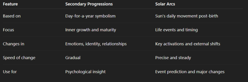 Unlike progressions, solar arcs are more external in their influence. They align closely with real-life changes in career, relationships, location, or health.
